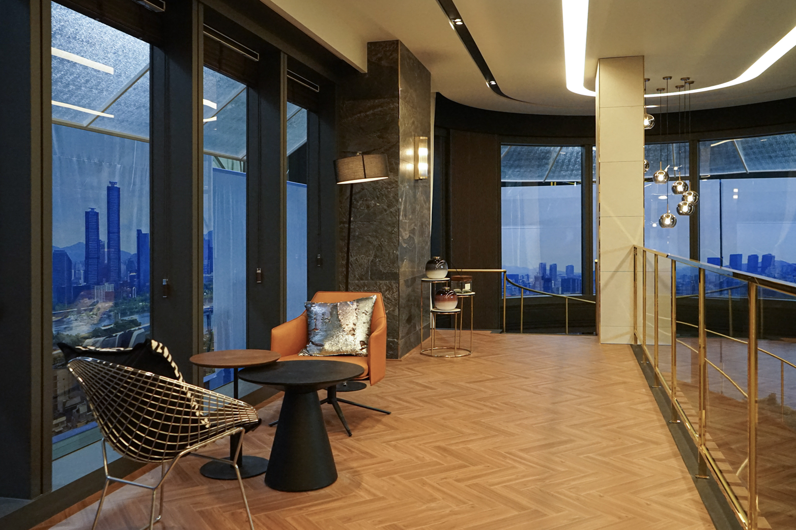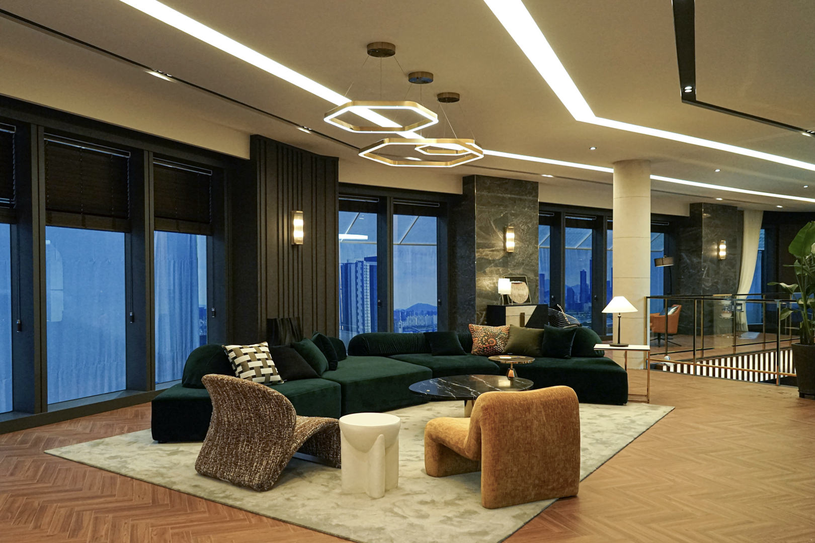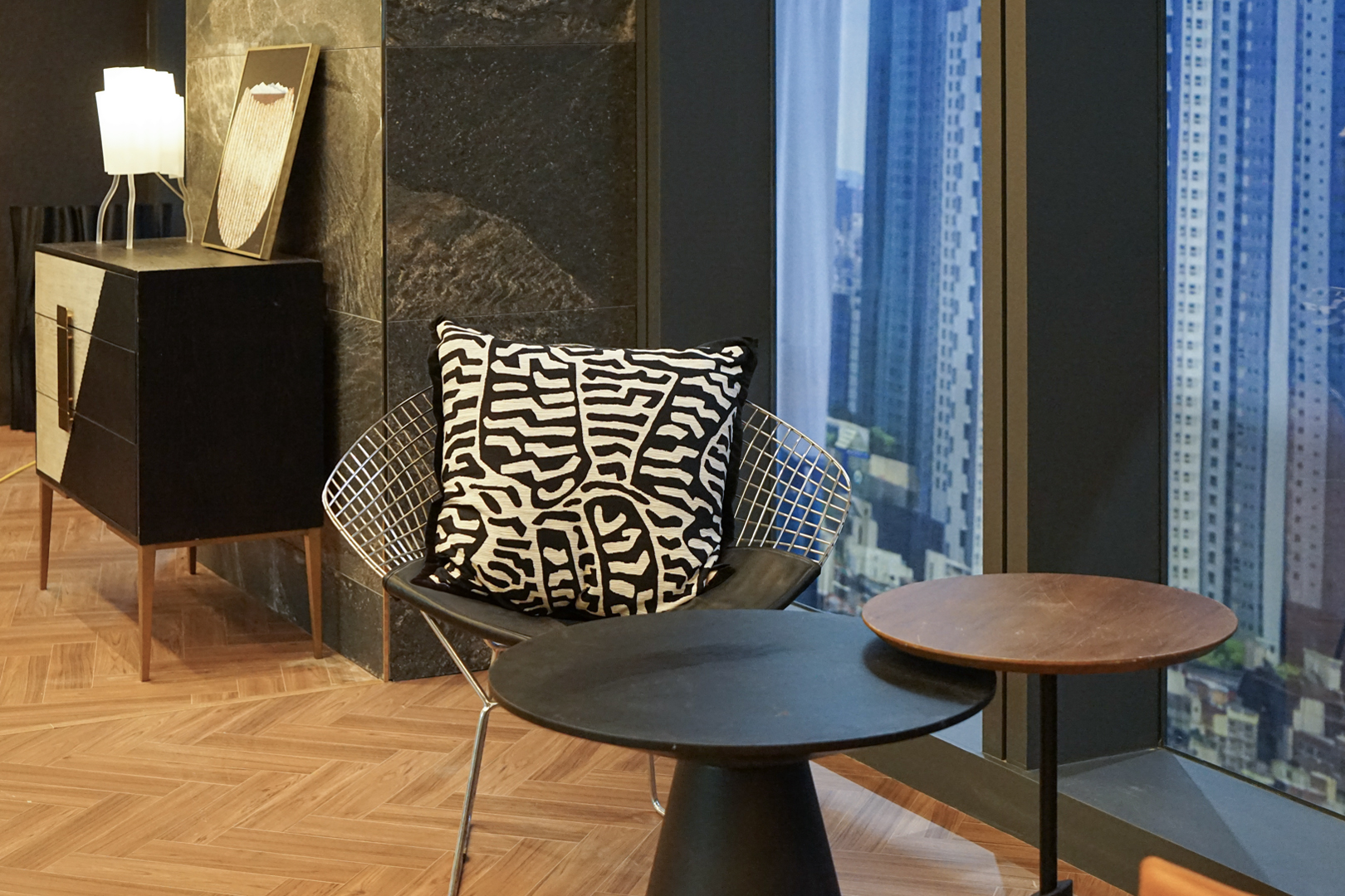 2층 복도 라운지 공간에는 개성을 더하는 두 가지 쿠션이 포인트로 사용되었습니다. 과감한 패턴 쿠션은 흩어지는 시선을 확실히 잡아주며 공간에 리듬을 더하고, 메탈릭 스팽글 쿠션은 조명에 따라 은은하게 반짝이며 텍스처를 형성해 1인 체어에 강한 존재감을 부여합니다. 배우의 생활 공간답게 과하지 않으면서도 절제된 조명과 소재의 조합 속에서 세련된 품격이 묻어나는 라운지를 완성했습니다.