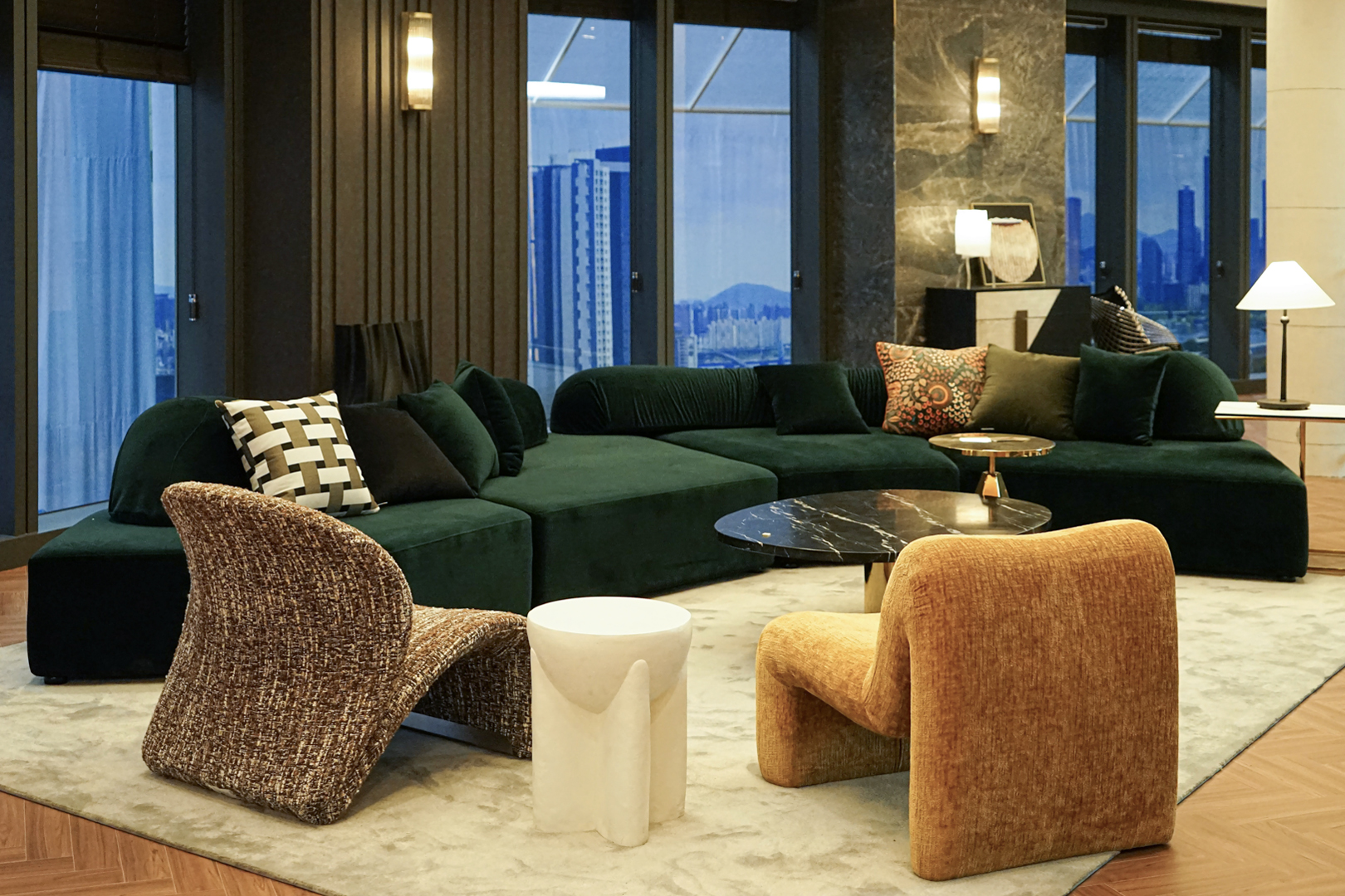 2층 거실은 짙은 그린 컬러의 소파와 다크한 벽체가 중심을 이루는 공간으로, 단조로움을 피하면서도 소파와 자연스럽게 어우러지도록 모노톤의 벨벳 쿠션과 패턴 쿠션을 조합했습니다. 포인트 컬러의 가구를 한층 화사하게 밝혀주는 실버 컬러의 러그는 공간에 포근한 분위기를 더하고 공간의 영역을 나누어 자연스러운 동선을 연출합니다. 벨벳 포인트 쿠션은 카메라 무브먼트에 따라 빛을 받는 면이 미세하게 달라지며 장면마다 깊이와 입체감을 더해줍니다.