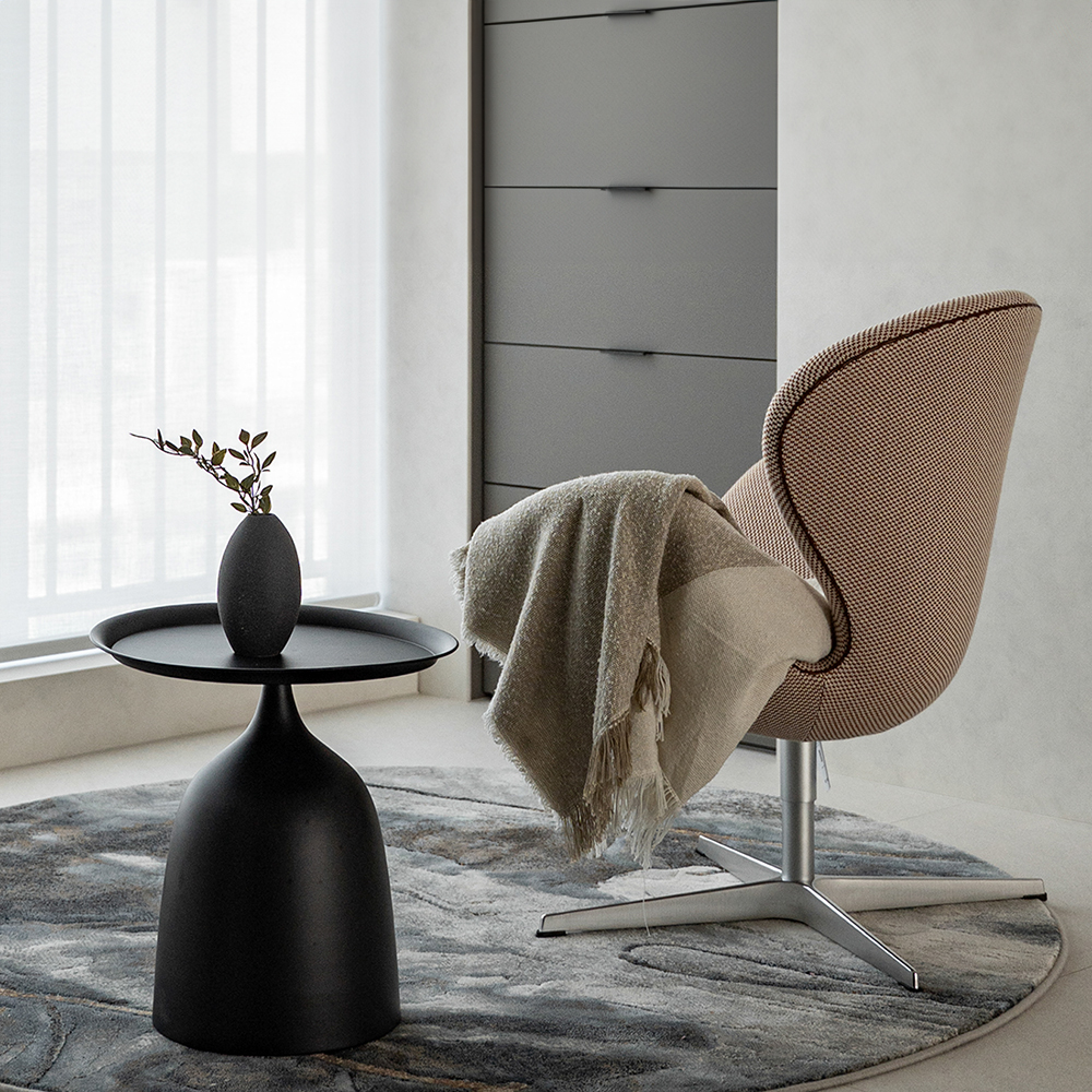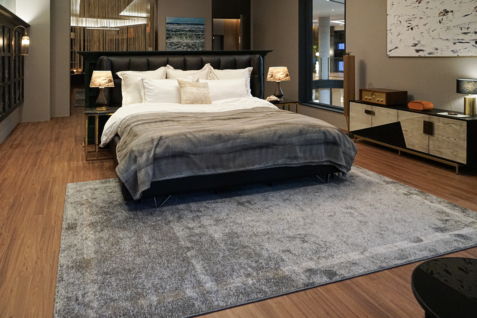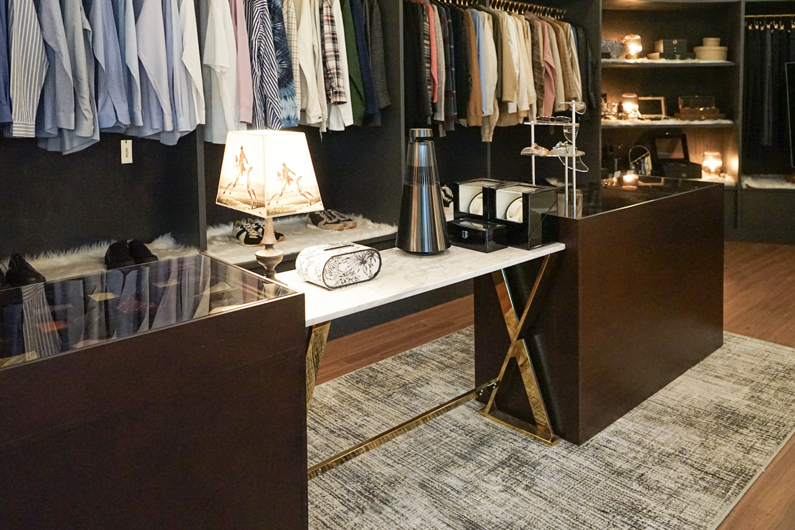 2층 침실에는 침대 하단부에 길게 배치한 러너 스타일 러그를 사용해 여백을 자연스럽게 정리하고 조명 아래에서 고르게 퍼지는 그레이 톤으로 아늑한 분위기를 완성했습니다. 깔끔한 컬러로 무드를 잡아주어 침실의 고요함을 해치지 않으면서 공간 전체를 부드럽게 감싸주는 효과가 있습니다. 다크 우드와 메탈 소재가 많은 드레스룸은 자칫 차가워보일 수 있는데 은은한 패턴의 모노톤 러그를 깔아 포근함을 더하고 의류 컬러와 자연스럽게 조화를 이루도록 연출했습니다. 섬세한 텍스처가 단정한 분위기를 유지해주며 드레스룸의 정돈된 무드를 안정적으로 잡아주는 역할을 합니다.