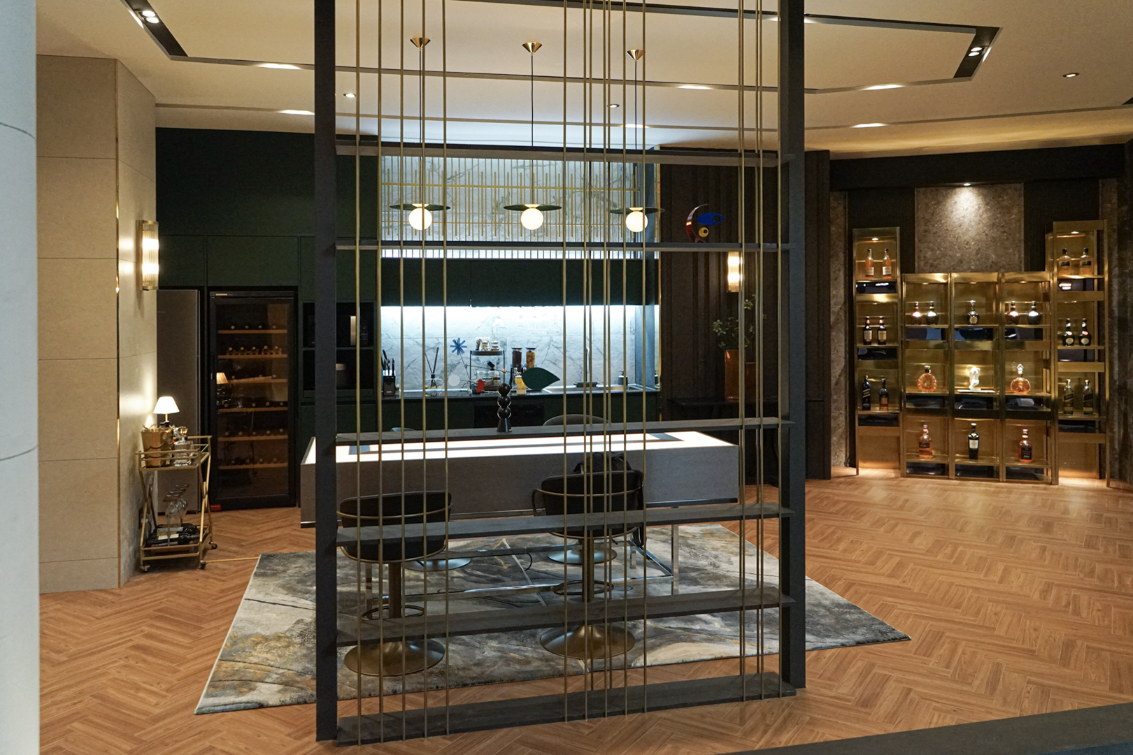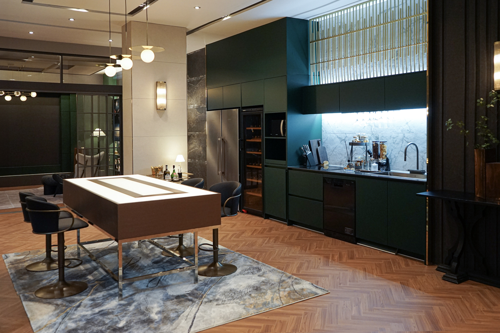 1층 다이닝 공간에는 푸른 대리석과 잔잔한 골드 패턴이 섬세하게 어우러진 러그가 적용되었습니다. 부드러운 블루 톤과 유려한 선이 흐르는 듯한 디자인이 공간에 청량한 고급스러운 분위기를 더합니다. 자칫 밋밋할 수 있는 다크 그린 톤의 키친과 테이블을 자연스럽게 연결하면서도 차가운 소재의 가구를 아늑하게 감싸줍니다. 특히 다이닝 공간에서는 러그 두 장을 나란히 이어 배치했는데 이러한 구성은 추후 공간 재배치 시에 분리하여 각각 다른 장소에서 활용할 수 있는 실용적인 장점을 갖추고 있습니다. 중심축을 기준으로 패턴을 데칼코마니처럼 좌우대칭으로 펼치면 시각적인 통일감과 완성도를 높여줍니다.
