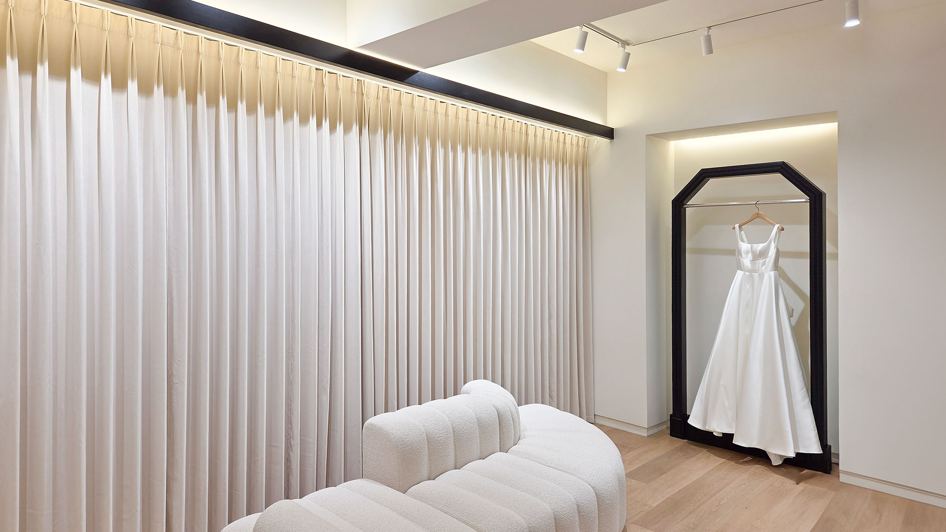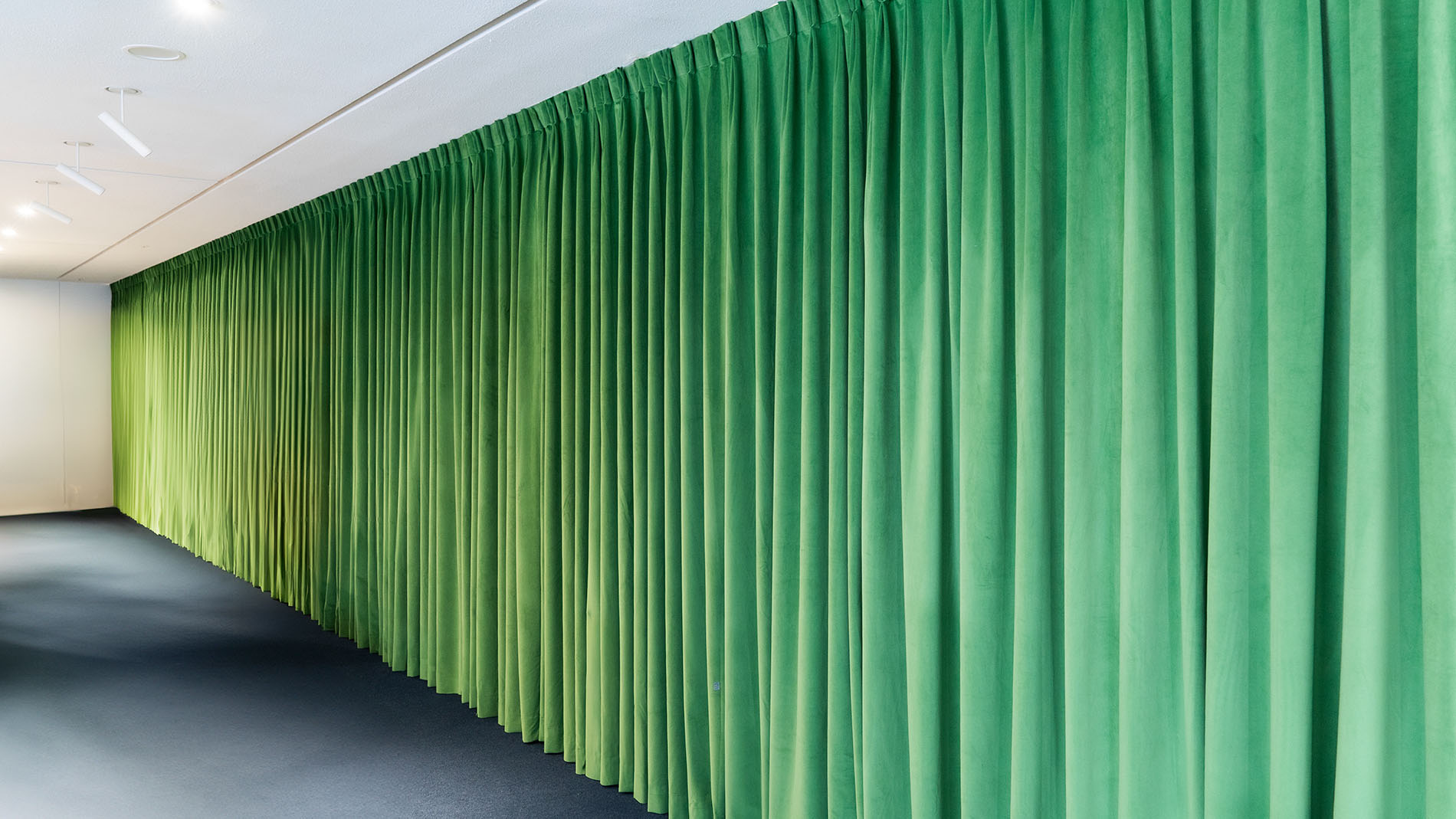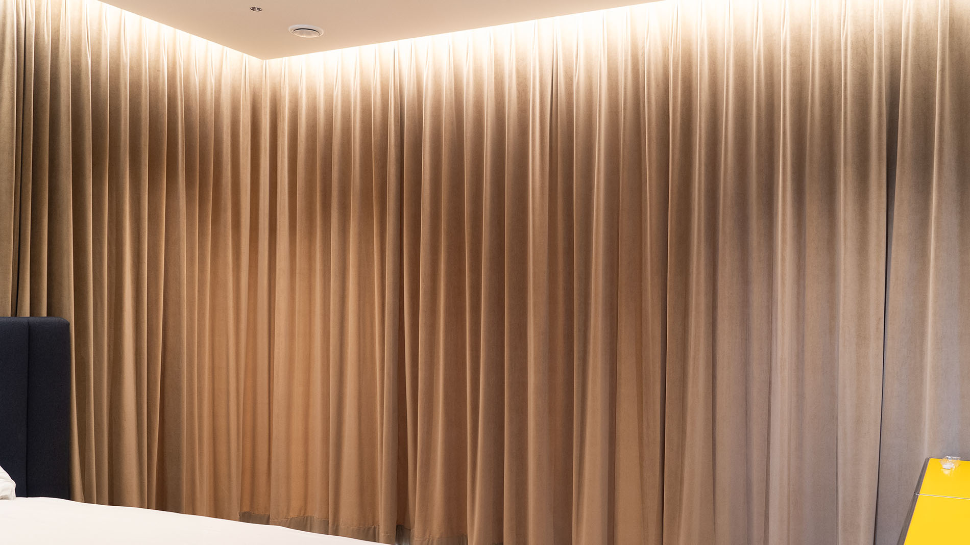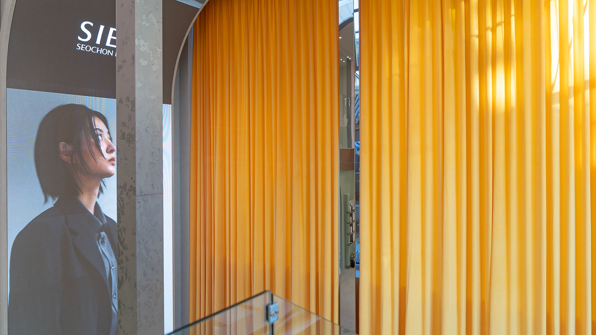 기능적인 이유보다도 벨벳 소재가 가진 디자인적 표현력 때문에 선택하시는 경우가 많은데요. 벨벳은 표면에 형성된 파일 조직으로 인해 방향에 따라 색의 농도와 명암이 달라 보이는 특징을 가지고 있습니다. 이로 인해 같은 컬러라도 평면적인 원단보다 깊이감 있는 색 표현이 가능하며 공간에 자연스러운 입체감을 더해줍니다. 커튼으로 연출했을 때는 원단의 중량감이 주름을 또렷하게 잡아주어 창 주변의 인상이 정돈되어 보입니다. 특히 넓은 창이나 높은 천장에서는 수직적인 주름이 강조되면서 공간의 비례와 스케일을 시각적으로 보완해 주는 역할을 합니다.